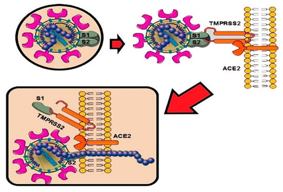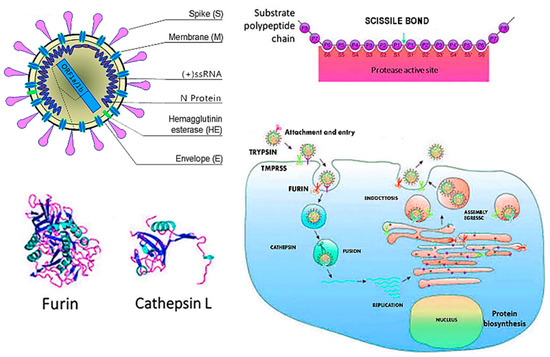 Therefore, the virus SARS-CoV-2, through the protein S, reduces the expression of the ACE2 enzyme by also mitigating the potential as well as the number of available receptors, with a subsequent increasing of the angiotensin II and worsening of the lung lesions [91]. A particular attention has been given to the proteins S or spike placed on the envelope and the bond with the receptor (angiotensin-converting enzyme 2) ACE2 of the host cell, ensuring the connection and the invasion of the virus in the cell. It was already observed since the previous SARS-CoVs that the proteins S of the virus were related to the receptors ACE2, mainly in the lungs and intestine. It has also been shown that there is a significant presence of the oral mucosa, by highlighting it as an important site in the spreading and developing of the SARS-CoV-2 infection [94]. The viral protein S (spike protein), placed on the envelope, binds to the ACE2 receptor of the host cell. The protein S of the SARS-CoV-2 virus is structurally similar for 76.5% to the one of SARS-CoVs and MERS-CoV [15,90]. The authors have noted that the energy released by the hydrogen bonds with the protein S of the virus SARS-CoVs on the human ACE2 (receptor for human infection) is of −50.6 kcal/mol, which represents a significant value of affinity of the bond with human ACE2, but weaker than the proteins spikes of SARS-CoV-2 with ACE2 virus (−78 kcal/mol). This leads to confirming one of the higher affinities of the proteins of spikes of the SAR-CoV-2 virus than the Sars-CoVs [91]. Thanks to the techniques of cryogenic electron microscopy, so-called spike surface markers have been detected, distributed on the virus surface as a corona (causing the name of the virus) [95]. As the invasive nature of the host cell plays a fundamental role for the infection, it has been stated that “spikes are the main target of the neutralized antibodies, so they are important for the study of vaccines and therapies” [96]. Scientists observed a peculiarity of SARS-CoV-2, not noticeable in other similar coronaviruses, such as the SARS-CoVs, but in other influenza non-SARS viruses, which is the presence of a cleavage site similar to the furin in the glycoprotein spike (PS), between the two subunits S1 and S2 of the 2019-nCoV [97]. Furin is an enzyme in the cells, belonging to the class of hydrolase that catalyzes the release of ripe proteins from the inactive precursors through the break of the bond Arg–Xaa–Yaa–Arg (Xaa maybe any amino acid and Yaa arginine or lysine) [97,98,99,100]. The furin is an enzyme included in lots of human tissues; it would maybe make the virus able to infect several organs and give a high ability of transmission [99,100,101,102,103,104,105,106], as it has been observed that it may be possible also to find it in other viruses that infect with a relative easily, among those the influenza ones (in this case they are not placed on the spicules, but on a protein called hemagglutinin) [104,107]. The regulation of the viral cells by the protease is a control process, which is usual among the viruses [106]. It is often necessary for the maturation and infectivity of the virus. An important group of proteases of the host cells, used by several viruses, is the family of proprotein convertase (PC), including furin, PC4, PC5, PACE4, and PC7. It has been shown that when PCs develop viral proteins, some viruses become more infective and pathogenic. The majority of studies made on the maturation of virus by the PCs has been focused on the furin [104]. Several families of virus use the PC of host cells to manage their access process of the cells [106]. The enzymatic cleavage of the peptide bond by the PC encourages the bond and the fusion of the viral particles with the target cells [106]. According to another study of Coutard et al., issued on Antiviral Research, the presence of the cutting site for the furin may influence the lifecycle and the pathogenicity of the coronavirus [100]. Practically, the furin has a key role in the viral infection by cutting the glycoproteins of the viral envelope and improving the infection with the host cells [107]. The cleavage operated by the furin allows a transmissibility and invasion 1000 times more than the SARS-CoVs. Moreover, the furin determines the systemic diffusion of the virus, as the protease is involved in the activation of many functional activities [104]. The furin is considerably present in the lung tissue, in the intestine, and the liver, this would make those organs as potential target of the 2019-nCoV infection [97,108]. The access of the virus through the ACE2 receptors shall be encouraged by the presence of some protease placed on the cell surface, in proximity, almost attached to the ACE2 receptor (Figure 2). Among those proteases, in particular, we can find the serin-protease TMPRSS2 (protease transmembrane, serine 2) acting in synchrony with the ACE2 receptor and the furin [109,110,111] (Figure 3).
