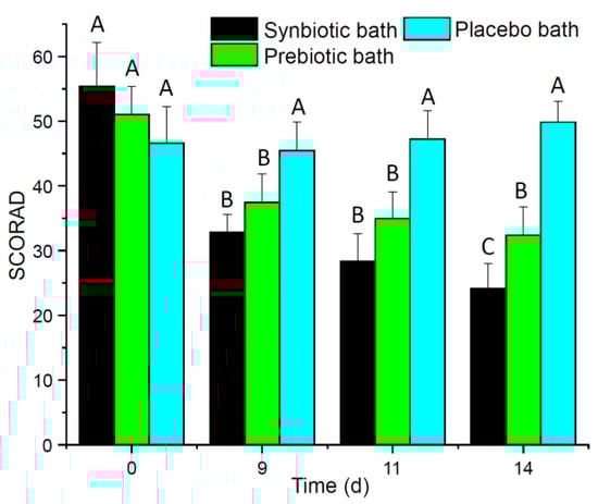 Severity scoring of atopic dermatitis (SCORAD) of atopic dermatitis (AD) patients after daily synbiotic (black bar, n = 7), prebiotic (green bar, n = 8) or placebo bath (cyan bar, n = 7) over time. Error bars indicate standard deviation. Different letters above bars within panels indicate significant differences (p < 0.05) according to two-way analysis of variance (ANOVA).