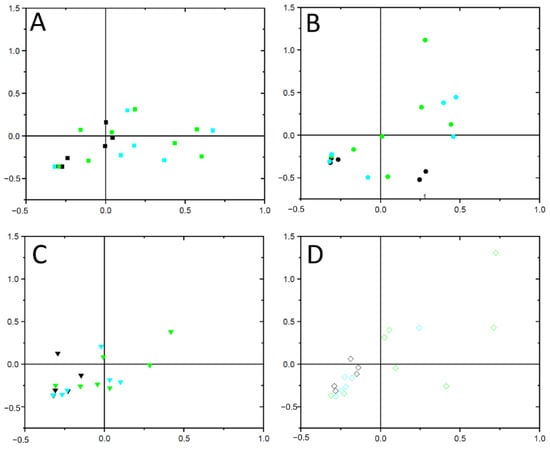 Correspondence analysis of the bacterial skin microbiome retrieved from AD patients after daily synbiotic (black), prebiotic (green) or placebo bath (cyan) before start (A, ■), and after 9 (B, ●), 11 (C,▼) and 14 days of bath treatment (D, ◊). The eigenvalues of the 1st and 2nd axes were λ1 = 0.53 and λ2 = 0.48.