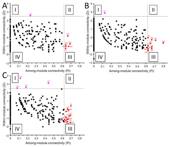 Network roles of each OTU of the bacterial skin microbiome retrieved from AD patients after daily synbiotic (A), prebiotic (B) or placebo bath treatment (C). Each OTU was categorized into module hubs (I), network hubs (II) connectors (III) or peripherals (IV) according to Olesen et al. (2007) [29]. OTU details of I-III can be found in Table 2 and OTU details of IV can be found in Supplementary Table S2.