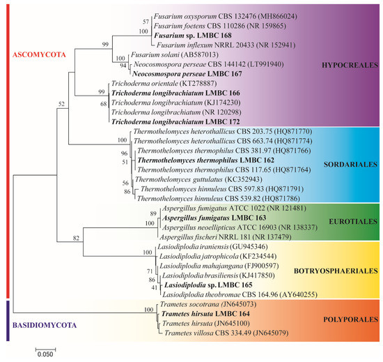 Fungi were isolated at the campus of the University of São Paulo, Ribeirão Preto, Brazil. The city has four main vegetation groups: mesophytic forests, deciduous forests, swampy forests, and cerrado [40]. All biomes have a significant number of jatoba and tamarind trees. Among the isolates, eight fungi were grown and maintained at laboratory conditions. The molecular identification showed high phylogenetic diversity (Figure 1), with representatives from the Phylum Ascomycota (Fusarium sp. LMBC 168; Neocosmospora perseae LMBC 167; Trichoderma longibrachiatum LMBC 166; LMBC 172; Thermothelomyces thermophilus LMBC 162; Aspergillus fumigatus LMBC 163, Lasiodiplodia sp. LMBC 165; and the Basidiomycota (Trametes hirsuta LMBC 164). LMBC stands for Laboratory of Microbiology and Cell Biology. This difference in phyla found represents the vast diversity of microorganisms found in biomes still little explored, wherein a small area.