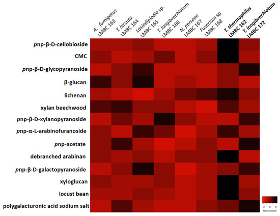 This study’s next goal was to select among the eight identified fungi the best enzyme producers in a medium supplemented with tamarind seeds as a carbon source. A system of cultivation under agitation, for 72 h, was used. As observed in the heatmap (Figure 2), the principal enzyme producers were T. thermophilus LMBC 162 and T. longibrachiatum LMBC 172.