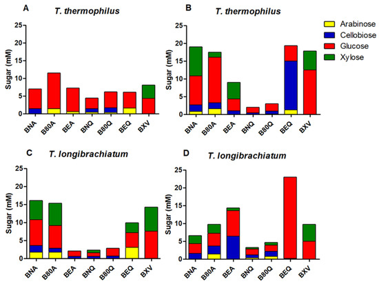 Sugars content in hydrolysates. BNA: sugarcane bagasse pretreated by autohydrolysis; B80A: SP80-3280 sugarcane culm pretreated by autohydrolysis; BEA: culms of energy cane pretreated by autohydrolysis; BNQ: sugarcane bagasse pretreated chemically; B80Q: SP80-3280 sugarcane culm pretreated chemically; BEQ: culms of energy cane pretreated chemically; BXV: steam explosion sugarcane bagasse. (A,B) values of T. thermophiles; (C,D) values of T. longibrachiatum.