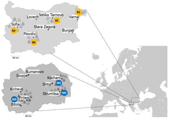 Geographic map depicting Europe with a close-up of Bulgaria (top) and North Macedonia (bottom) indicating the origin of the analysed strains, corresponding to four Bulgarian regions (B1 to B4) and three North Macedonian regions (M1 to M3).