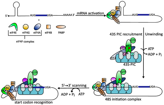 Schematic illustration of the eukaryotic translation initiation mechanism (modified from [38]). Binding of the heterotrimeric eIF4F complex to the 5′ cap structure of mRNAs is followed by unwinding of stable RNA secondary structures by the DEAD-box RNA helicase eIF4A. This enables binding of the 43S preinitiation complex (PIC), which scans down the 5′-untranslated regions (5′UTRs) to identify the start codon AUG.