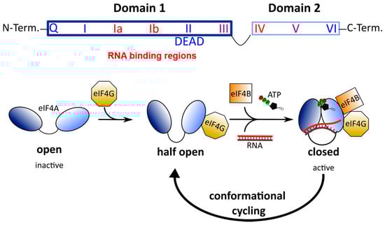 - Harms, U.; Andreou, A.Z.; Gubaev, A.; Klostermeier, D. EIF4B, eIF4G and RNA regulate eIF4A activity in translation initiation by modulating the eIF4A conformational cycle. Nucleic Acids Res. 2014, 42, 7911–7922. [Google Scholar] [CrossRef]