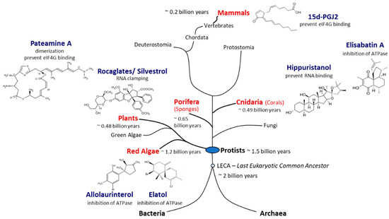 Natural producers of molecules with eIF4A inhibitory activity. Compounds with eIF4A inhibitory activity can be isolated from red algae, plants, sponges, corals, and mammals. Red algae are the phylogenetically most ancient phylum of multicellular eukaryotes for which putative eIF4A inhibitors could be identified. Porifera are the most primordial multicellular animals, and cnidaria are the first animals that developed tissues. Plants and mammals are terrestrial producers of eIF4A inhibitors. Potent eIF4A inhibition has been demonstrated for rocaglates, pateamine A, and hippuristanol. The chemical structures of the inhibitors are diverse and some compounds appear to be straightforward derivatives of other bio-molecules such as sterols in case of hippuristanol or prostaglandins in case of 15d-PGJ2. Although eIF4A inhibitors have not yet been identified in fungi, blocking of eIF4A appears to be a widespread mechanism in eukaryotes.