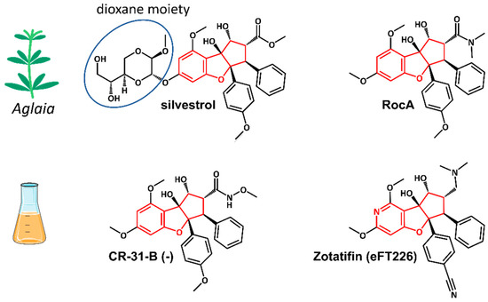 Rocaglates are a group of flavaglines that contain a characteristic cyclopenta[b]benzofuran structure (Figure 4) [28,29].