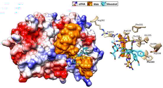Predicted binding mode of silvestrol using structure-based computational modeling of silvestrol onto the eIF4A–RNA complex (PDB: 5ZC9). The dioxane moiety of silvestrol has the potential to form additional contacts with arginine residues on the surface of eIF4A and may thus bridge over the RNA substrate to tightly clamp the RNA onto eIF4A [83]. UCSF (University of California, San Francisco) Chimera was used for graphical illustration and electrostatic surface coloring of eIF4A (blue: positive charged, red: negative charged).