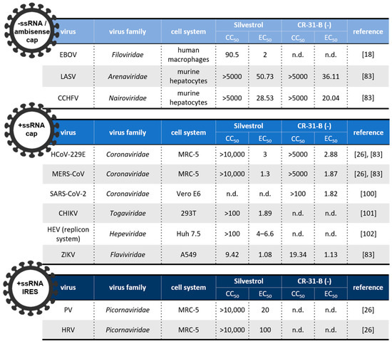 - Henss, L.; Scholz, T.; Grünweller, A.; Schnierle, B. Silvestrol Inhibits Chikungunya Virus Replication. Viruses 2018, 10, 592. [Google Scholar] [CrossRef]
