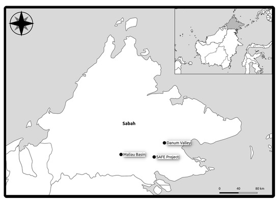Sabah has an average annual rainfall of 2630 mm per year [33] and annual average temperature of 26 °C (World Bank data). Local rainfall and relative humidity can vary substantially at the regional scale and are strongly influenced by topography, e.g., for two localities within the SAFE area rainfall varies between 2373 and 2619 mm per year. It is further influenced by forest cover as suggested by the difference of rainfall data between SAFE and a station at Danum with 2884 mm per year. Relative humidity (RH) was measured at Danum base camp at 8 and 14 h every day and could differ as much as 30% between readings where the 1st reading was >98% on most days. Temperature also varied greatly from 20–24 °C to 30–35 °C during a 24 h period [34]. The geology for Danum valley and the SAFE sites is mainly argillaceous rocks with some arenaceous and calcareous beds. The soils at Danum valley are orthic acrisol and dystric cambisols [35]. The soils at the SAFE project are mostly orthic acrisols, orthic luvisols, dystric and eutric cambisols and lithosols. Maliau’s geology is mainly arenaceous and argillaceous rocks with some chaotic deposits, and coal and calcareous beds. The soils of Maliau are orthic acrisols, dystric cambisols, gleyic podsols, humic gleysols and lithosols [35].