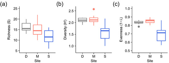 Boxplots of (a) richness (S), (b) diversity (H’) and (c) evenness (1 − λ) of lichen taxonomic group versus site (D = Danum Valley Conservation Area, M = Maliau Conservation Area [old growth sites]; S = Stability of Altered Forest Ecosystems [SAFE] Project area [logged site].