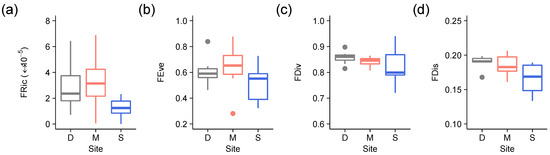 Boxplots of (a) functional richness (FRic), (b) functional evenness (FEve), (c) functional divergence (FDiv) and (d) functional dispersion (FDis) calculated for lichen functional groups versus site (D = Danum, M = Maliau [old growth sites]; S = SAFE [logged site]). Colour codes are grey for Danum, red for Maliau and blue for SAFE.