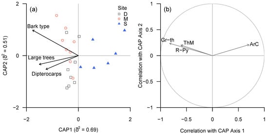 (a) CAP ordination plot of lichen community structure (taxonomic groups) according to continuous environmental (tree trait) variables, based on ‘plot-level’ data summarised for each plot. (b) Spearman rank correlation coefficients between CAP axes and individual taxa for which |ρ| ≥ 0.6. Taxonomic groups in (b): ArC—Cryptothecia, Gr-th—thelotremoid Graphidaceae, R-Py—Phyllopsora and Krogia, ThM—Melanophloea).