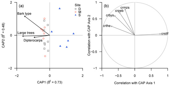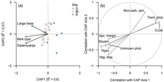 Prior to plot-level analyses, pairwise Spearman rank correlations were used to assess the extent of collinearity among tree traits. Overall, although there appeared to be a moderate positive relationship between the proportions of large trees and dipterocarps within plots (ρ = 0.64), there were no strong correlations between bark type diversity and proportions of large trees, trees with buttresses/flutes and dipterocarp trees that might be expected to severely disrupt the interpretation of results (|ρ| ≤ 0.7 [63]), therefore all four variables were included in subsequent analyses (Table S5). The biota–environment (BIOENV [64]) routine was used to identify the optimal subset of environmental variables accounting for variability in lichen community structure, via maximisation of the rank correlation between environmental and biological distance matrices. The variables identified by the BIOENV analysis were then used in the dbRDA analysis. The resulting ordination plots incorporated vectors representing. Spearman rank correlations were calculated between continuous environmental variables and the first two CAP axes.