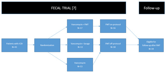 Of the included patients who had undergone FMT as a study treatment and those randomized to antibiotic treatment who received FMT off-protocol after antibiotic failure, long-term follow-up data about the recurrence of CDI, antibiotic use, general health, hospitalization, and mortality were collected via a structured telephone interview combined with a review of hospital records, if available. A recurrence was defined as a new microbiologically proven episode of CDI. Participants were contacted at two different timepoints—approximately two and ten years after FMT. Primary healthcare physicians were contacted if a patient was untraceable or unable to provide the information. Cause of death was evaluated by a gastroenterologist and infectious diseases specialist to determine if the cause of death was possibly attributable to FMT.