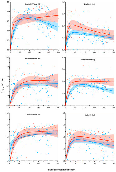Figure 1 represents the level of antibody response by days after symptom onset according to severity. Depending on the assay and/or the population considered, a rapid increase in antibody titers was observed followed by a plateau phase or a decrease phase. After 300 days, hospitalized patients had overall a higher maximal response peak and a more persistent antibody response (e.g., the Roche NCP total antibody and the DiaSorin S1 + S2 IgG assays).