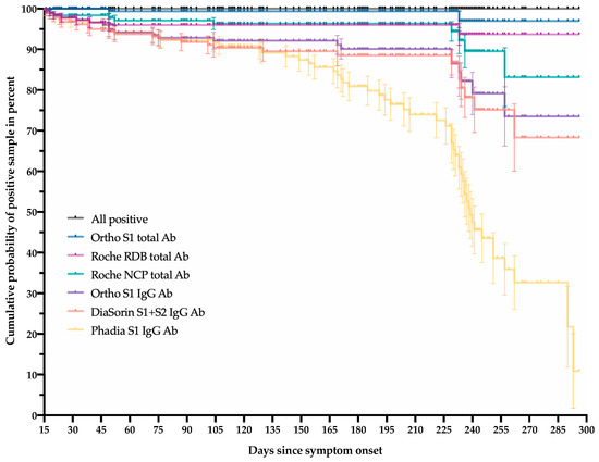 The cumulative probability of positive samples after 14 days until the last follow-up point, i.e., 300 days, using six different commercial assays.