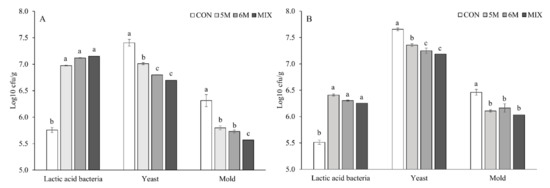 Effects of dual-purpose inoculants on mean count of all microbes from corn silages without (A) or with contamination of Fusarium graminearum (B) during 120 h of aerobic exposure. The mean count was obtained by generating microbial count data from 0 to 120 h. CON, corn silage applied without inoculant; 5M, corn silage applied with Lactobacillus brevis 5M2; 6M, corn silage applied with Lactobacillus buchneri 6M1; MIX, corn silage applied with the mixture of L. brevis 5M2 and L. buchneri 6M1 at 1:1 ratio. a–c: Means in same microbe with different superscripts differ significantly (p < 0.05). Error bar represents standard error.