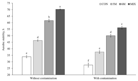 Generally, silages with contamination had lower aerobic stability than silages without contamination (p < 0.001; 42.8 vs. 53.1 h; Figure 2). The highest aerobic stability was produced by MIX silage, followed consecutively by 6M silage, 5M silage, and CON silage both without contamination (p < 0.001; 70.3 vs. 61.7 vs. 46.3 vs. 33.9 h) and with contamination (p < 0.001; 56.2 vs. 50.0 vs. 37.5 vs. 27.5 h). In addition, the interaction effect between inoculant application and Fusarium contamination was reported (p = 0.005) in the aerobic stability result. Its interaction presented that 6M silage with contamination had a similar result to 5M silage without contamination (50.0 and 46.3 h) and 5M silage with contamination had a similar result to CON silage without contamination (37.5 and 33.9 h).