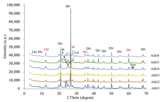 X-ray diffraction patterns for the six sampled rock layers. Chl—chlorite; ab—albite; Mu—muscovite; Qtz—quartz; Cal—calcite; Kao—kaolinite. The red font is mainly described in the text.