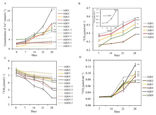 (A) Ferrozine-extractable Fe (II) in enrichments. (B,D) The production of 12CO2 and 13CO2. (C) Anaerobic oxidation of 13CH4. The dotted line represents the heat-inactivated control group. Error bars represent one standard deviation of the mean (n = 3). The asterisk represents the significance of the t-test results between the 28 day and the initial data (0 day in Figure 5A,C, 7 day in Figure 5B,D) in experimental group (*** p < 0.001, ** p < 0.01, * p < 0.05).