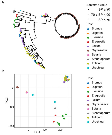 - Zhong, Z.; Norvienyeku, J.; Chen, M.; Bao, J.; Lin, L.; Chen, L.; Lin, Y.; Wu, X.; Cai, Z.; Zhang, Q.; et al. Directional Selection from Host Plants Is a Major Force Driving Host Specificity in Magnaporthe Species. Sci. Rep. 2016, 6, 25591. [Google Scholar] [CrossRef] [PubMed]