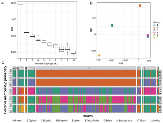 2.2. Phylogeny and Population Structure of the M. oryzae Species Complex