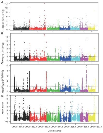 - Gautier, M.; Klassmann, A.; Vitalis, R. REHH 2.0: A reimplementation of the R package REHH to detect positive selection from haplotype structure. Mol. Ecol. Resour. 2016, 17, 78–90. [Google Scholar] [CrossRef] [PubMed]