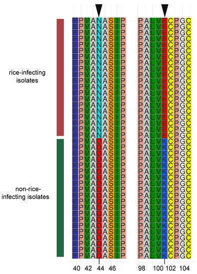- Tosa, Y.; Osue, J.; Eto, Y.; Oh, H.-S.; Nakayashiki, H.; Mayama, S.; Leong, S.A. Evolution of an Avirulence Gene, AVR1-CO39, Concomitant with the Evolution and Differentiation of Magnaporthe oryzae. Mol. Plant.Microbe Interact. 2005, 18, 1148–1160. [Google Scholar] [CrossRef] [PubMed]