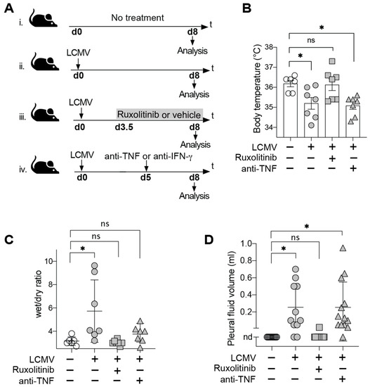 Ruxolitinib Treatment Prevents Microvascular Leak and Terminal Disease in LCMV-Infected HHD Mice. (A) Schematic illustration of the experimental timeline. HHD mice were infected intravenously (i.v.) with LCMV on day 0. Infected animals were treated with either Ruxolitinib (i) by oral gavage every 12 h between day 3.5 and 8 or with anti-TNF (ii) intraperitoneally on d5. Animals in the control group (iii) were left untreated. All animals were euthanized 8 days post infection in order to measure iNOS mRNA expression in liver, pleural effusions and skin edema. (B) Body temperature was measured on day 8. n = 5–8. (C) Wet/dry ratios of ventral skin flaps harvested on day 8 of infection. n = 5–8 (D) Pleural effusions were quantified on day 8 of infection. nd, not detectable. Symbols show individual mice. Results in (D) summarize data from 11–14 mice in each group from two experiments. One representative experiment (B,C) of two independent experiments is shown. * p < 0.05 by one-way ANOVA with Dunnett’s post-test; ns: not statistically significant.