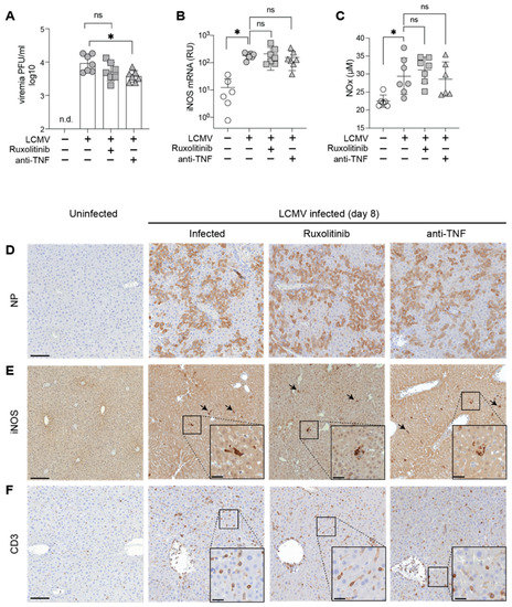 Protective Activity of Ruxolitinib is not Linked to iNOS Expression, Serum NOx Levels or Viral Load. HHD mice were infected with LCMV on day 0 and treated with Ruxolitinib or anti-TNF as in Figure 1. (A) iNOS mRNA (relative units, RU) in the liver. (B) Total combined nitrite (NO2−) and nitrate (NO3−) concentration (NOx) in serum of day-8 infected and uninfected mice. (C) Viremia on day 8 of infection. n.d.: not determined. (D–F) 8 days post infection, liver tissues were prepared for histological analysis and were compared to uninfected HHD mice. Sections were processed for immunohistochemical detection of LCMV NP, iNOS and T cells (CD3). Arrows indicate iNOS expressing cells. Scale bar: 100 μm. Scale bar in insets: 20 μm. Symbols representing individual animals and the mean ± SEM of 6–7 mice per group from one of two independent experiments are plotted (A–C). * p < 0.05 by one-way ANOVA with Dunnett’s post-test in comparison with infected; ns, not significant.