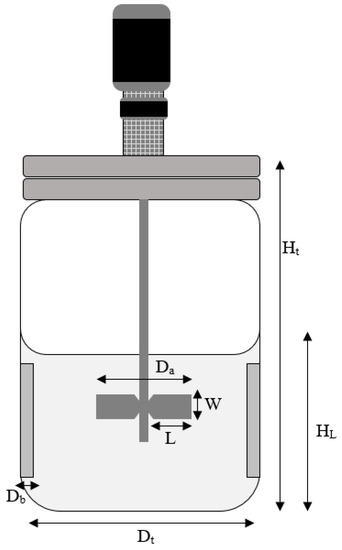 Schematic diagram of 2 L stirred tank bioreactor. Note: HL—High of liquid; Ht—High of bioreactor; Dt—Diameter of tank; Da—Diameter of impeller; Db—Diameter of baffles; W—Impeller blade height; L—Impeller blade width.