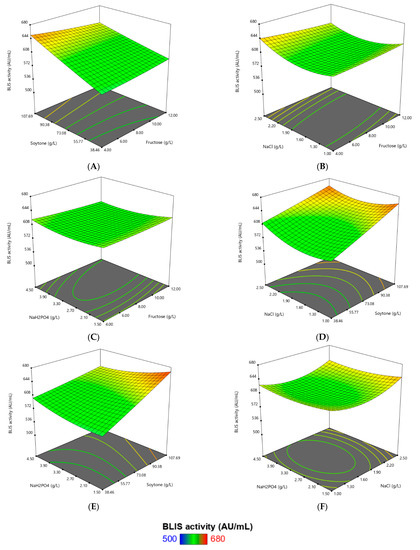 Figure 3A–F represents the response surface plots intercorrelating three investigated components with BLIS response while the other variables are kept constant at the middle level. The largest coefficient of the amount of soytone indicated that the effect of the amount of soytone was found to be the main influential factor and had a significant and positive impact on the production BLIS. In Figure 3A, BLIS activity increased from 573.63 AU/mL to 653.29 AU/mL and from 589.57 AU/mL to 631.81 AU/mL when the amount of soytone increased from 38.46 g/L to 107.69 g/L at the low and high levels of fructose, respectively. These results showed that BLIS production was increased rapidly with the increasing amount of soytone. A similar trend was also observed in the interactions between soytone and NaCl (Figure 3D) and the interactions between soytone and Na2HPO4 (Figure 3E).