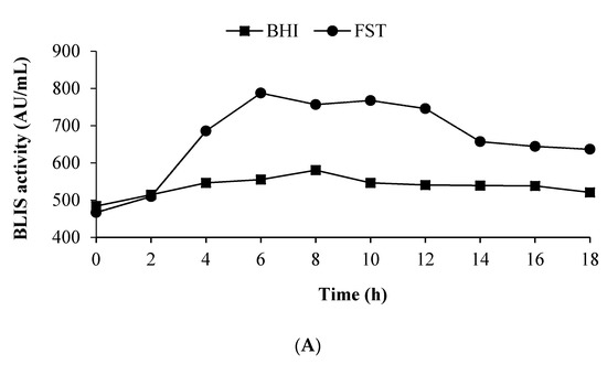 The fermentation performance of BLIS production by L. lactis Gh1 in both commercial BHI and the optimized (after this referred to as FST) media as predicted by ANN using 2 L stirred tank bioreactor are shown in Table 7 and Figure 6. The maximum BLIS activity (787.40 ± 1.30 AU/mL) and cell concentration (0.87 ± 0.00 g/L) were about 1.36 and 2.02 times higher in the FST medium as compared to BHI medium, respectively (Figure 6A). The fermentation time for FST medium (6 h) to achieved maximum BLIS activity was also shorter than that obtained in fermentation with BHI medium (8 h).