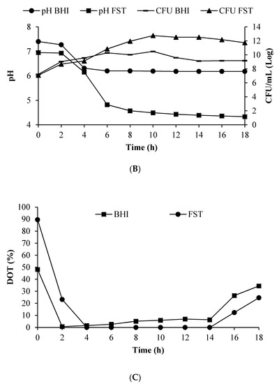 Time to achieved maximum cell concentration was similar in both media (10 h) (Figure 6B). However, the FST (12.76 log CFU/mL) recorded 1.22 higher in cell growth as compared to the BHI medium (10.48 log CFU/mL). Cell reduction was observed in the BHI medium (at h-12), while the cells were maintained in the FST medium with lower pH reduction in line with cell growth. At BHI medium the DOT level was dropped to 0% saturation at h-2 and gradually increased at h-4. While, in FST medium the DOT level dropped to 0% at h-2 and remained for 12 h, before resumed at 16 h of fermentation (Figure 6C).