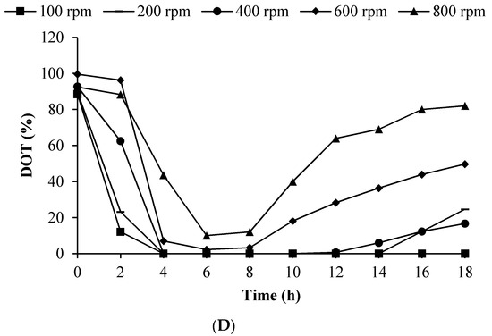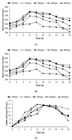 The cell viability was preserved at 200 rpm, where the highest viable cell concentration (11.73 log CFU/mL) was obtained at 18 h of fermentation. On the other hand, the lowest viable cell concentration (8.73 log CFU/mL) was recorded at impeller speed of 800 rpm (Figure 6B). The high and low cell viability was very much related to the DOT profile recorded at 200 and 800 rpm. At impeller speed of 100, 200 and 400 rpm, the DOT level was dropped to very low levels after 4 h of fermentation and remained at 0% saturation for 18, 10 and 8 h, respectively. In the case of 600 (2.2–3.3%) and 800 (10–12%) rpm, the DOT level was dropped to the lowest for only 2 h. Effect of different impeller speeds (100–800 rpm) on BLIS production by L. lactis Gh1is summarised in Figure 7.