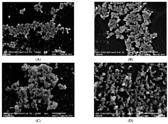 Scanning electron microscopy of L. lactis Gh1 at magnification ×5000. (A) Control-fresh cells; (B) 100 rpm (10-h); (C) 200 rpm (10-h); (D) 400 rpm (10-h); (E) 600 rpm (8-h); (F) 800 rpm (8-h).