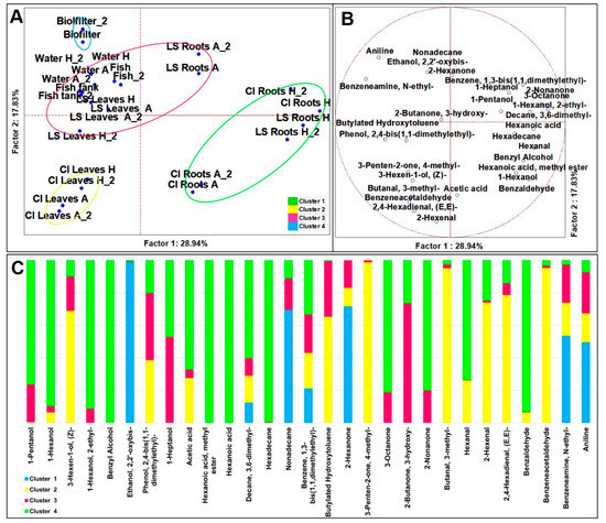 Through SPME-GC-MS, among the 13 duplicated cases (n = 26), 45 molecules were identified with a more than 80% of similarity with the NIST 11 MSMS library and the NIST MS Search program 2.0 (NIST, USA). On average, 24 were relatively quantified in the system, 32 in the leaves and 37 in the roots (Figure S1). For a landscape description of the volatilome, a dataset of 29 molecules was generated, and to find evidence that those compounds able to discriminate among the ecological niches, we chose to super-normalize the VOC datasets on the basis of the sampling sites (n = 26) (Table S1) in these three ecosystems: (i) Lactuca sativa (LS) (n = 8); (ii) Cichorium intybus (CI) (n = 8); and (iii) the cultivation systems (n = 10). So far, to each dataset we applied multivariate analyses, as untargeted PCA (Principal Component Analysis) (p < 0.05), to weight the descriptors, and targeted MANOVA (p < 0.01) (Figure S2) to address the specific contributions to VOC production [19,20,21]. Twenty-nine significant VOCs over 13 duplicate cases (ANOVA, p < 0.05) were processed by the PCA, which grouped the samples in different directions on the plane where K-means analysis identified four clusters (Figure 1A–C). Two clusters were made only by roots and leaves, one by both leaves and roots and the system components, and one by the biofilter. Cluster 1 was positioned on Quadrant I and included only the biofilter. It was described by lower speciation made by just 7 compounds, including nonadecane and 2-hexanone, as more abundant than in the other clusters, and ethanol, 2,2′-oxybis as an exclusive signature. Cluster 2 contained only CI leaves, from both the aquaponic and hydroponic system. It was described by 17 variables and it was addressed by higher concentrations of 3-penten-2-one, 4-methyl-, butanal, 3-methyl-, and benzeneacetaldehyde. In fact, from the MANOVA (Figure S2), the first compound accounted for 93.1% of total cases to CI leaves, the second accounted for 86.9%, while the third to 89.7%. In the literature, it is known that butanal, 3-methyl is produced both from the plant tissue and microorganisms and is responsible for off-odors with a fermentative/acidic character [22]. The presence of this molecule in CI leaves could be due to the shear-induced stress. Cluster 3 included components of the system and leaves, and roots of LS. This cluster was described by 22 variables, and amid 2-butanone, 3-hydroxy- (also known as acetoin) was the most abundant among every cluster. Some microorganisms, such as LAB, have the ability to synthesize acetoin using different enzymes and pathways [23]. Natural acetoin also has been detected in fruits, vegetables and flours, contributing to their distinct natural flavors [23], and has shown to be an antimicrobial targeting foodborne pathogens and spoilage microorganisms [24]. Cluster 3 was described also by 1-heptanol. In fact, from the MANOVA (Figure S2), this compound accounted for 81.7% of the total cases to LS roots. Lastly, Cluster 4 was positioned oppositely to Clusters 1 and 2, and it was formed by all the roots, except LS from aquaponics. It was described by a higher speciation, made by 27 molecules out of 29 and by a typical signature made by benzyl alcohol, hexanoic acid, methyl ester-, hexanoic acid and hexadecane.