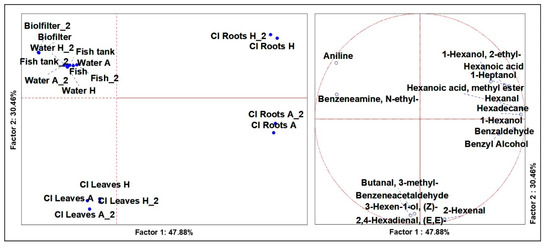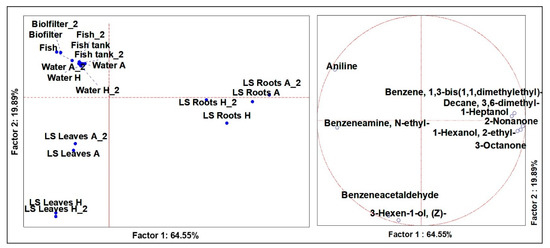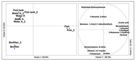 From the ANOVA, including samples obtained from different sensible sites of the cultivation systems (n = 13), significant differences (p < 0.01) were defined for the 16 different VOCs. From the PCAs (Figure 4), a robust plane was evidenced, based on two factors defining 33.33% and 58.70% of the total representations. Results from the PCA showed a clear distinction amid biofilters, fishes, and waters. In particular, the waters were better described by butylated hydroxytoluene, 1-hexanol, 2-ethyl- and benzene, 1,3-bis (1,1-dimethylethyl)-, while the biofilter was characterized by benzeneamine, N-ethyl-, ethanol, 2,2′-oxybis-, 2-hexanone and aniline. The attribution of aniline to the biofilter is desirable, ensuring that this molecule did not flow into the cultivation waters, because it has a strong toxicity and would inhibit the growth of aquatic plants and animals [29]. Finally, fishes were described by 2-butanone, 3-hydroxy-, hexanal and 1-pentanol.