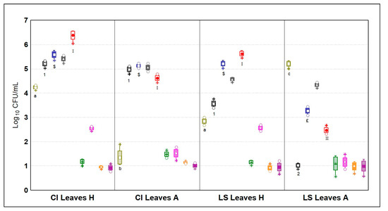 Microbial quantities in Log10 CFU/mL (n = 4) of nine different microbial targets; olive green = coliforms; black stripes = Enterobacteriaceae; blue = aerobic mesophilic bacteria; gray = anaerobic mesophilic bacteria; red = psychrotrophic bacteria; green = lactic acid bacteria; fuchsia = yeasts and molds; orange = Pseudomonas spp.; violet = enterococci; CI = Chicorium intybus; H = hydroponic cultivation; A = aquaponic cultivation; LS = Lactuca sativa. Different letters, numbers, Greek letters, Latin numbers or symbols indicate statistical significance among a microbial target by Tukey’s HSD test (p < 0.05). Samples were analyzed in duplicate from two independent experiments (n = 4). Box = mean; rectangles = mean*S.D.; whiskers = min and max values; asterisks = extremes; dots = outliers.