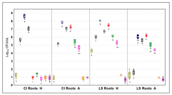 Microbial quantities in Log10 CFU/mL (n = 4) of the nine different microbial targets; olive green = coliforms; black stripes = Enterobacteriaceae; blue = aerobic mesophilic bacteria; gray = anaerobic mesophilic bacteria; red = psychrotrophic bacteria; green = lactic acid bacteria; fuchsia = yeasts and molds; orange = Pseudomonas spp.; violet = enterococci; CI = Chicorium intybus; H = hydroponic cultivation; A = aquaponic cultivation; LS = Lactuca sativa. Different letters, numbers, Latin numbers, or symbols indicate statistical significance among a microbial target by Tukey’s HSD test (p < 0.05). Samples were analyzed in duplicate from two independent experiments (n = 4). Box = mean; rectangles = mean*S.D.; whiskers = min and max values; asterisks = extremes; dots = outliers.
