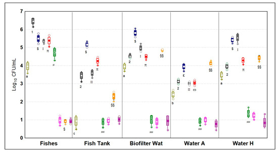 Microbial quantifications in Log10 CFU/mL (n = 4) of the nine different microbial targets; olive green = coliforms; black stripes = Enterobacteriaceae; blue = aerobic mesophilic bacteria; gray = anaerobic mesophilic bacteria; red = psychrotrophic bacteria; green = lactic acid bacteria; fuchsia = yeasts and molds; orange = Pseudomonas spp.; violet = enterococci; Fishes = Fillets of Nile tilapia; Fish tank = water samples from tank for fishes; Biofilter Wat = water samples from the biofilter; Water A = water samples from tank of aquaponic cultivation; Water H = water samples from tank of hydroponic cultivation. Different letters, numbers, Latin numbers, Greek letters, or symbols indicate statistical significance among a microbial target by Tukey’s HSD test (p < 0.05). Samples were analyzed in duplicate from two independent experiments (n = 4). Box = mean; rectangles = mean*S.D.; whiskers = min and max values; asterisks = extremes; dots = outliers.