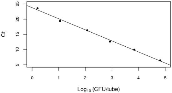 The calibration data (Ct vs. log10 CFU Xcc per PCR tube) (Figure 2) had an excellent linear fit (r2 = 0.99, P < 0.001) with a slope of −3.64, indicating a PCR efficiency of 88%. The intercept was 23.8 when log10 (CFU) = 0 (i.e., CFU of Xcc in the PCR tube = 1). As it makes no sense to be able to detect less than a single bacterial cell in a tube, and the Zur gene copy number per cell has been estimated as one [25], we therefore took this value to be the cutoff for detection of Xcc based on the real-time PCR (Table A1).