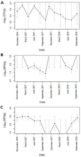 In the second approach, the data from both the conventional PCR and the nested real-time PCR were analyzed as binomial values (i.e., detection or not of Xcc DNA in the PCR tube). The combined data for the nine samples at each sampling date were then used to estimate the mean population of Xcc in the soil as most probable numbers (MPNs) [26]. Estimates were obtained by fitting a generalized linear model to the data using the glm() function with binomial error distribution and complementary log-log link function using the sample date as a classifying factor, and using the log of the equivalent weight of soil in the reaction tube as an offset. Where all samples were either positive or negative, confidence limits were obtained using the mpn() function.