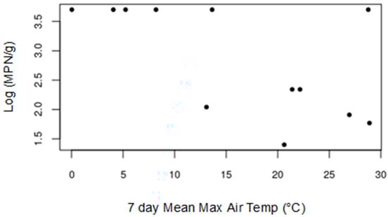 For the IE Ct derived values and the MPN values from conventional PCR there were no significant correlations. In the case of MPN values from the nested real-time PCR there were significant negative correlations with many temperature variables, the strongest being with the mean maximum air temperature in the week prior to sampling (r = −0.69, P < 0.05). This relationship is shown in Figure 4.