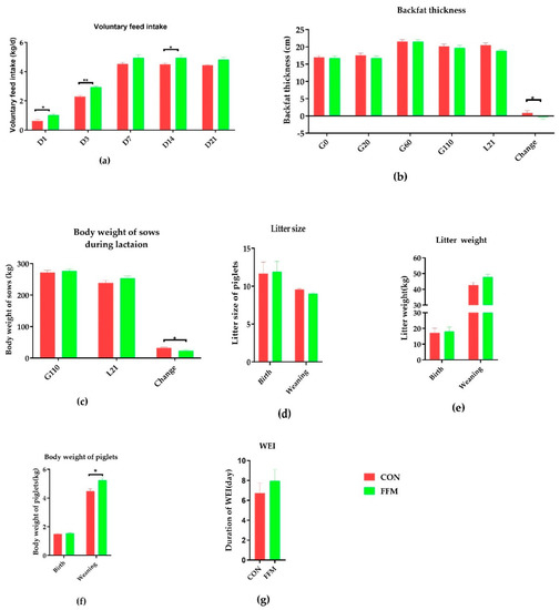 As shown in Figure 2, the voluntary feed intake (VFI) throughout the lactation period was significantly increased by FFM supplementation, mostly on L1, L3, and L21 (p < 0.05, Figure 2a). There was no difference in backfat thickness (BF) between the FFM and CON groups on gestation day 0, 20, 60, or 110 (p > 0.05, Figure 2b). Throughout the lactation period, the loss of BF and BW the sows in the FFM group were significantly lower than those in the CON group (p < 0.05).The mean ± SEM of BF values (centimeter) on L21 for the CON and FFM groups were 20.45 ± 0.68 and 18.85 ± 0.39 (p < 0.05). The loss of BW (kilogram) for the FFM sows was significantly less than that for those in the CON group (mean ± SEM of CON vs. FFM: 32.58 ± 2.68 vs. 23.20 ± 2.64; p < 0.05, Figure 2f).