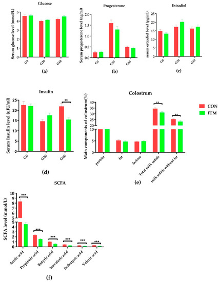 The sows’ serum concentrations of glucose (a), progesterone (b), estradiol (c), and insulin (d) were not affected by dietary treatment on G0, G20, or G60 (p > 0.05). However, serum insulin was significantly lower on G60 in the FFM sows than in the CON sows (p < 0.01) (Figure 2). On G60, the concentrations of all the tested SCFAs (f), including acetic, propionic, isobutyric, butyric, isovaleric, and valeric acid, were significantly lower in the feces of the FFM sows than in the CON sows (p < 0.01). By contrast, the concentrations of total milk solids and total milk solids excluding fat (e) were significantly lower in the FFM group than in the CON group (p < 0.05).