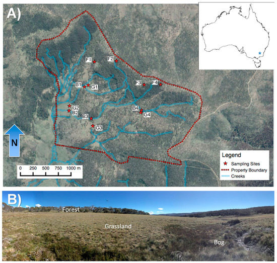 (A) Location of 548 ha experiment area (inset of Australia), and map of sampling sites within watershed and nearby streams. (B) Landscape-level photograph of the vegetation gradient from Sphagnum-dominated bog in foreground to eucalyptus-dominated forest in background. Abbreviations are F = forest, G = grassland, and B = bog. The numbers after the letter represent which transect the sampling location belongs to. Map and Image sources: L. Ingram andEsri, Maxar, GeoEye, Earthstar Geographics, CNES/Airbus DS, USDA, USGS, AeroGRID, IGN, and the GIS User Community. Photograph source: M.D. McDaniel.