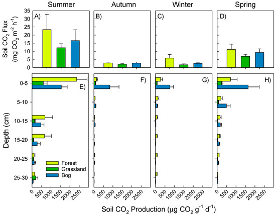 Mean soil-to-atmosphere CO2 fluxes (measured in situ) across the soils ranged from 2.5 to 17.4 mg CO2 m−2 h−1, in spring and summer, respectively (Figure 2A–D). Belowground, CO2 production (measured in the laboratory) decreased with depth. CO2 production thus dominated by emissions from the top 0–5 cm of soil that ranged from 72 to 2357 µg CO2 g−1 d−1. Contrastingly, at 25–30 cm depth, CO2 production ranged from 4 to 197 µg CO2 g−1 d−1. Forest and bog soils showed significantly greater CO2 production in summer than the grassland soil (p < 0.01, Figure 2E), ranging from 47 to 398% greater in forest soil or 60 to 282% greater in bog soil. There were less pronounced differences amongst soil types in autumn, winter, and spring.